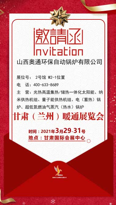 山西奥通锅炉环保自动有限公司将于2021年3月29日至3月31日参加2021甘肃(兰州)暖通展览会,展会地址是在甘肃·兰州国际会展中心。欢迎各界前来参观!