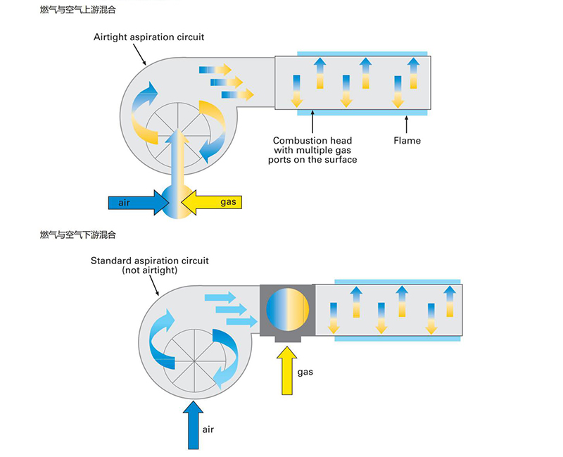 , 采用前预混燃烧技术,燃气和过剩,空气在风机前进行预混,预混气通,过风机吹入燃烧腔。